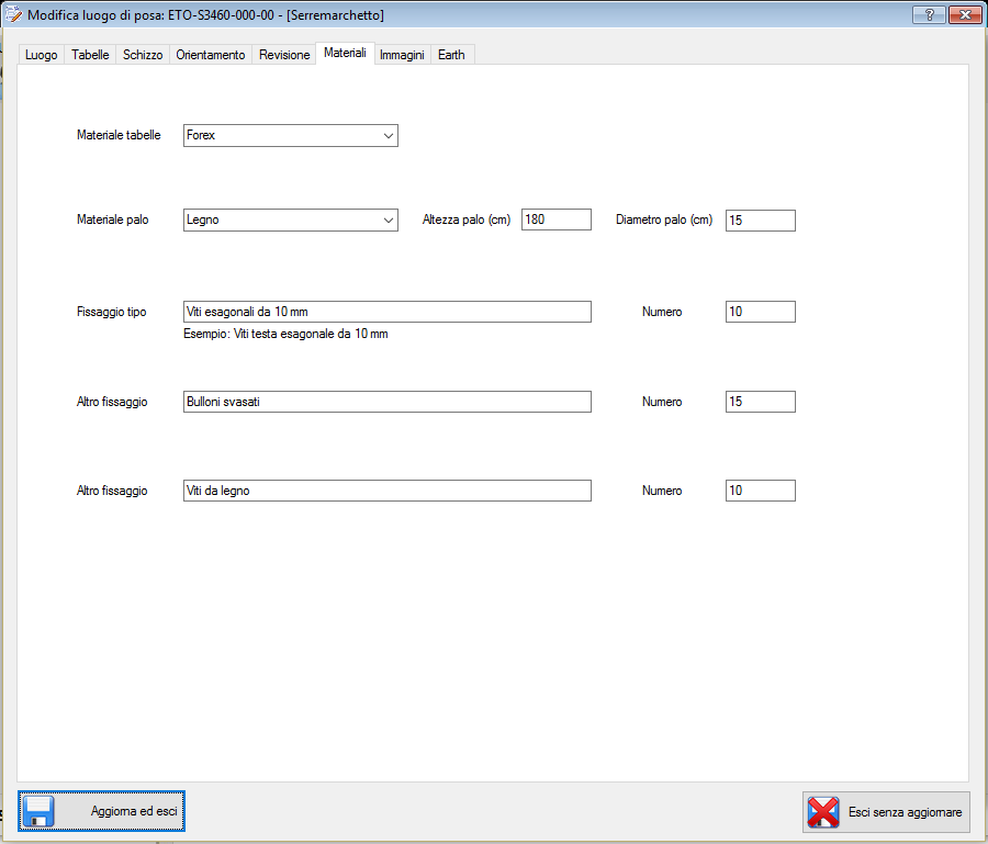 In questa scheda vengono inseriti i materiali usati nella posa, si può scegliere il materiale del palo e delle tabelle da una lista a discesa o inserirne di nuovi.